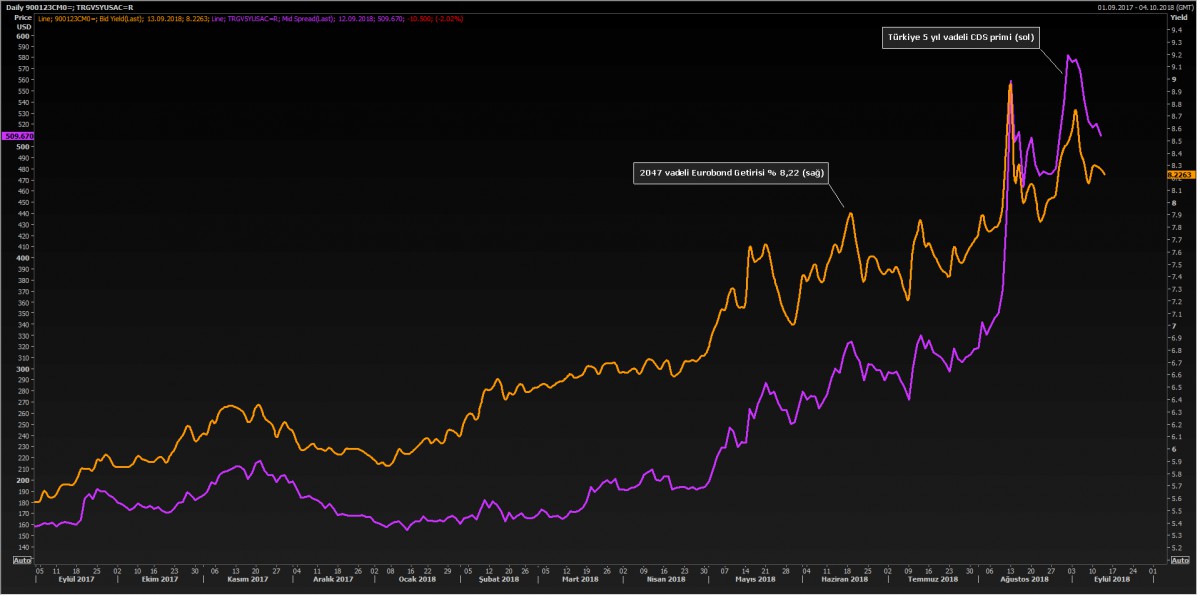 Türkiye’nin yabancı yatırımcı nezdinde riskini gösteren 5 yıl vadeli CDS primi (yani Türkiye tahvilini sigortalama bedeli) son dönemlerde o kadar sert yükseldi ki 2047 vadeli gösterge dolar cinsinden eurobondun getirisi ile arasındaki fark oldukça azaldı. 5 yıl vadeli CDS priminin kabaca 500 baz puan; eurobond getirilerinin ise %8 civarında seyrettiği düşünülürse, aradaki farkın %3 seviyelerinde olduğu ve ABD 10 yıllık tahvil getirisi kadar olduğunu görüyoruz. Bu grafik, yabancı yatırımcının getiri anlamında Türkiye risk alması için ortamın elverişli olmadığını söylüyor. Getirinin elverişli olması için, CDS priminin düşmesi veya eurobond getirisinin artması gerekiyor.