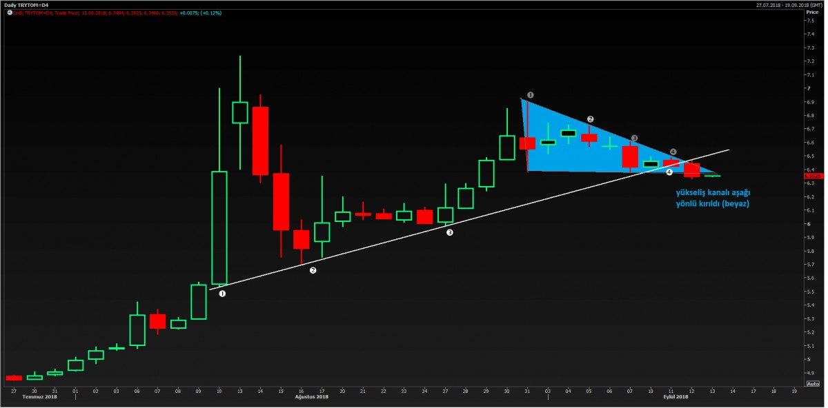 Günlük grafiklerde (beyaz çizgi) yükseliş trendinin son 3 gündür kırıldığını görüyoruz. Aynı zamanda, son günlerde üçgen formasyonuna benzeyen mavi de aşağı yönlü geçilmiş.