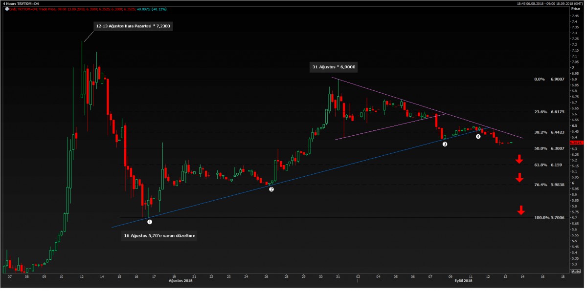 Daha da kısa vadeye indiğimizde, 4 saatlik grafiklerde, mavi yükseliş trendinin kırıldığını, üçgenin aşağı yönlü geçildiğini, 6.4423 seviyesindeki teknik bölgenin altına sarktığını görüyoruz. Bu bağlamda, teknik grafik bize düşüş eğiliminin hakim olduğunu söylüyor. Eğer bugün TCMB’den gelecek hamle TL’ye destek olursa, teknik bir bakış açısı ile, aşağıda kademeli olarak 6.30; 6.16; 5.98 ve nihayetinde formasyon hedefi olan 5.70 seviyesinin radar menziline gireceğini düşünüyoruz. Madalyonun diğer tarafında ise, yani TCMB’nin piyasa ile arasındaki farklı kapatamaması durumunda, yukarı yönlü hareketin sert olabileceğini düşünüyoruz.