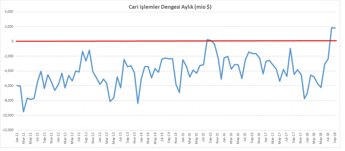 *İç talepteki sert daralma ve TL’deki değer kaybı sonucunda cari işlemler dengesi Eylül ayında da fazla verdi (bakınız grafik).