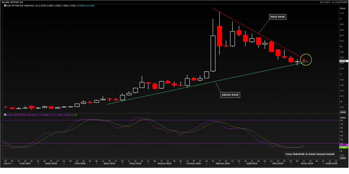 Haftalık grafiklerde, USD/TRY kurunda yaşanan sıkışma açık bir şekilde görülüyor. Teknik bir yaklaşımla, yavaş stokastik göstergesinin alım sinyali verdiğin görüyoruz. Önümüzdeki hafta tablonun daha da netleşeceğini düşünüyoruz.