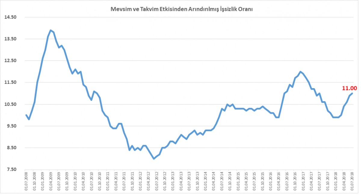 Dün TÜİK tarafından açıklanan temmuz ayı istihdam raporuna göre mevsimsellikten arındırılmış işsizlik oranı %11’e yükselerek son 1 yılın en yüksek seviyesine ulaştı. İşsiz sayısı Aralık 2017’deki dip seviyesine göre 383bin kişi yükseldi.