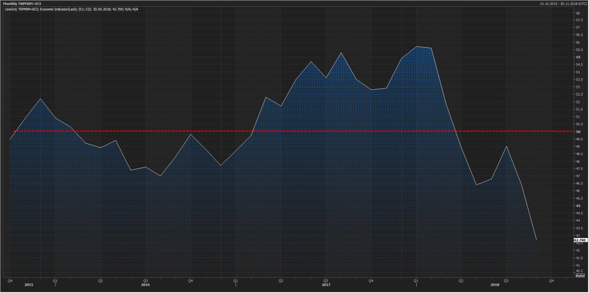 *Dün açıklanan veriler, Türkiye ekonomisinin resesyona girdiğini teyit eder mahiyette yorumlandı. İstanbul Sanayi Odası’nın (ISO) açıkladığı satın alma müdürleri endeksi (imalat PMI) 42.7 seviyesine gerileyerek son 9 yılın en düşük seviyesini test etti (bakınız grafik).