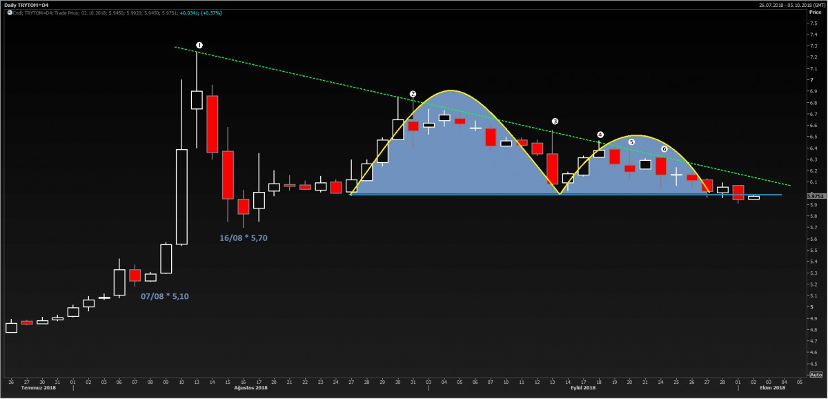 Yeşil çiziği ile gösterilen düşüş hareketinin devam edeceği beklentimizi uzun bir süredir dile getiriyoruz. Bu bağlamda, görünüm itibarı ile ters kulp ve fincan (cup with handle) formasyonu sergileyen USD/TL kurunda, aşağıda ilk etapta 16/08 dibi olan 5.70; formasyon hedefi olarak ise 5.10 seviyelerinin potaya girebileceğini düşünüyoruz. Yeşil çizginin herhangi bir sebeple yukarı yönlü geçilmesi (bugün itibarı ile) 6.14, ciddi bir al sinyali olarak okunacaktır.