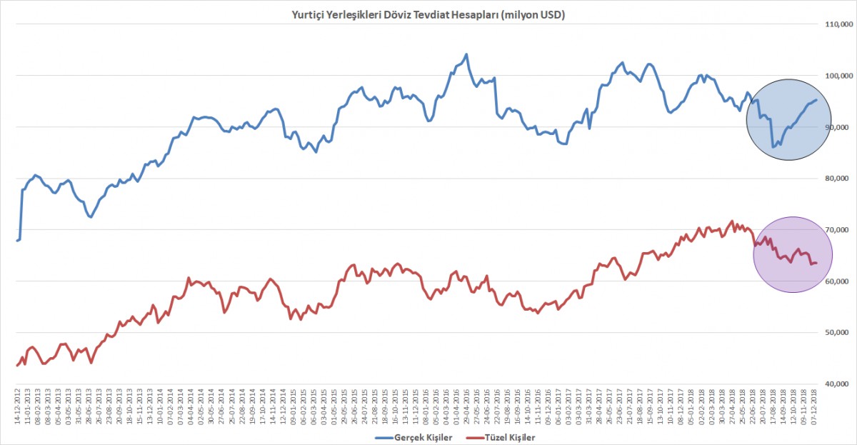 Her hafta perşembe günü TCMB tarafından açıklanan para ve panka istatistiklerini önemle takip ediyoruz. Döviz borcu olmayan bireylerin (gerçek kişilerin) son 4 ayda döviz tevdiat hesapları (DTH) 9.2 milyar dolar artarken (mavi), tüzel kişilerin ise 2.6 milyar dolar azalmış.