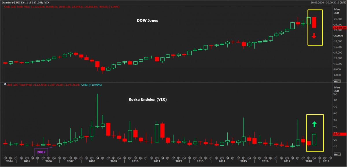 Özetle, küresel mali piyasalarda son dönemlerde etkili olan büyüyememe endişeleri ve satış baskısı, FED'in sanıldığı kadar güvercin olmaması nedeniyle devam ediyor. Trump'ın Meksika sınırına yapılması planlanan duvarın finansmanı noktasında Meclis ile restleşmesi, mevcut satış baskısını bir miktar daha sertleştirdi. Öyle ki, küresel borsalar, 2008 krizinden bu yana en kötü çeyrek performansı kaydediyor, korku endeksi VIX'in ise yükselmeye başladığını görüyoruz (bakınız grafik).