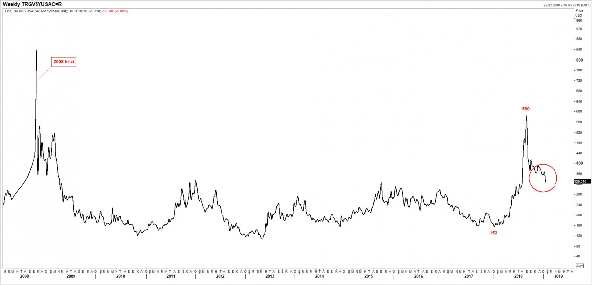 Yabancı yatırımcının Türkiye algısını yansıtan 5 yıl vadeli temerrüt takas primi (CDS) daha basit bir anlatımla, Türkiye tahvilini sigortalama bedeli nihayet gerilemeye başladı. Bunu olumlu bir gelişme olarak yorumluyoruz.