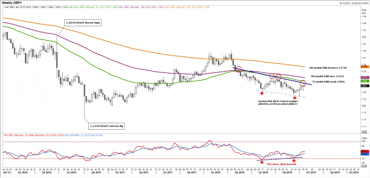 Büyük resmi görmek için haftalık grafikleri inceliyoruz. Mavi koyu çizgi ile çizdiğimiz ve cuma günü itibarı ile 1.30 seviyesinden direnç bulan GBP/USD paritesinde, bu hafta direnç seviyesinin aşılıp aşılmadığını takip edeceğiz. Olası yukarı yönlü kırışta, 1.3094, 1.3251 ve formasyon hedefi olarak 1.3718 hedeflenecektir. Madalyonun diğer tarafında ise, 1.2380 seviyesine kadar düşüş yönünde de büyük bir boşluk görüyoruz.