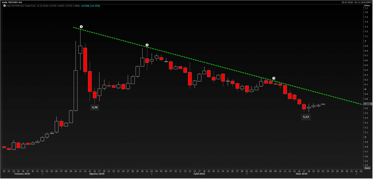 USD/TRY kurunda devam eden olumlu havanın yardımı ile aşağıda 5.52 seviyeleri geçen hafta perşembe günü test edildi. Teknik manada yeşil çizgi ile görülen düşüş trendi aşılmadan, herhangi bir yükselişten şimdilik söz edemeyiz. Ara bir seviye olarak ön plana çıkan 5.70 seviyesi de takip edilebilir.