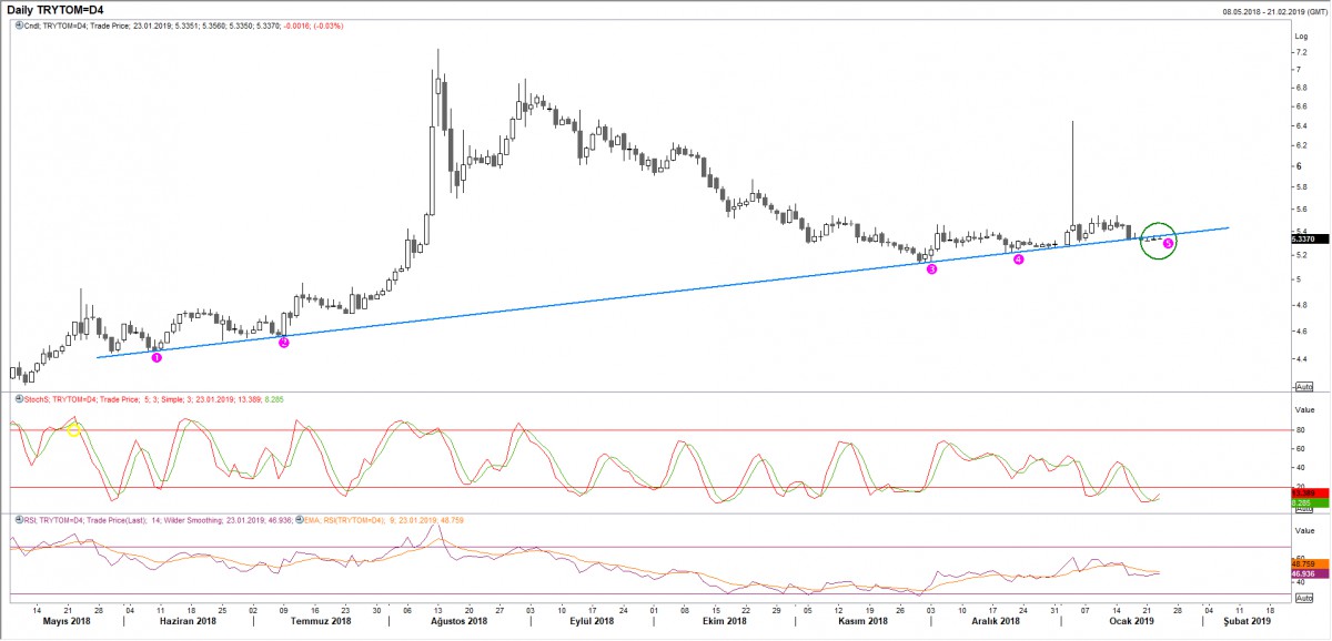 USD/TRY cephesinde günlerdir beklediğimiz aşağı yönlü kırılım henüz gerçekleşmedi. Aşağıdaki grafiklerde de görülebileceği üzere, mavi yükselen trend çizgisi etrafında salınan USD/TRY kuru (5 numara) aşağı gitme çalışmasında henüz başarılı olamadı.