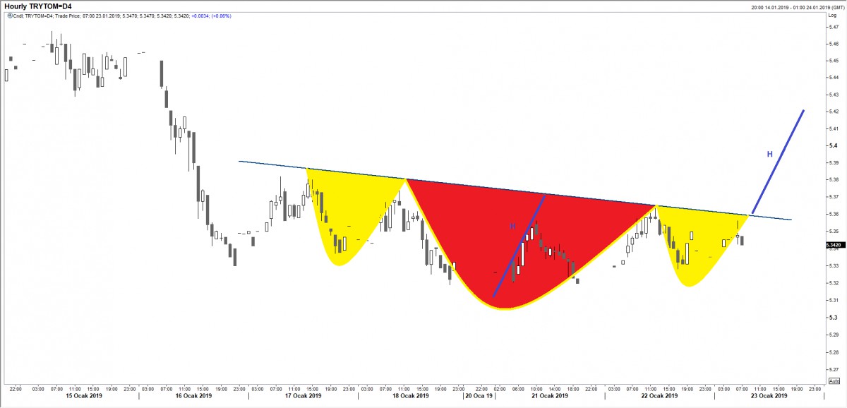 Daha kısa grafiklerde ise, teknik analizde çok fazla rastladığımız Ters Omuz Baş Omuz (TOBO) formasyonun görülebileceğine ihtimal veriyoruz. Yükselişin boyun çizgisi olan kabaca 5.36 üzerinde başlayacağını ve 5.42’yi hedefleyebileceğini göz ardı edilmemelidir.