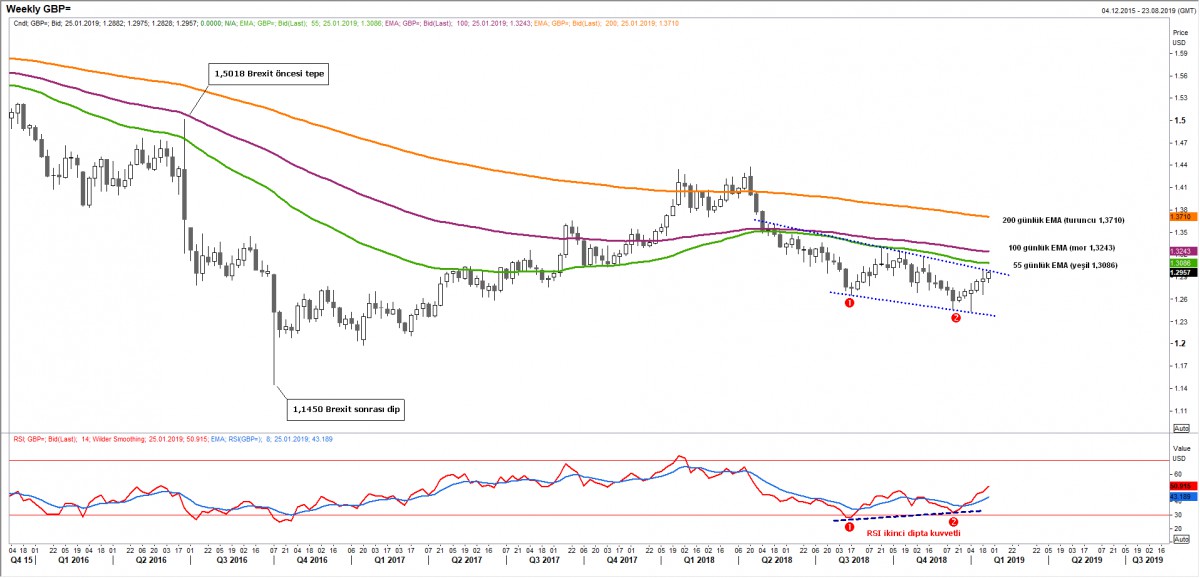 Sterlinin dolar karşısında 1.30 seviyesinden kurtulması durumunda (mavi kesik çizgi) sırası ile yukarıda 1.3086, 1.3243 ve formasyon hedefi olarak 1.3710 seviyesine doğru ilerleyeceğini düşünüyoruz. Aşağıda ise 1.2380 seviyesi bulunuyor.