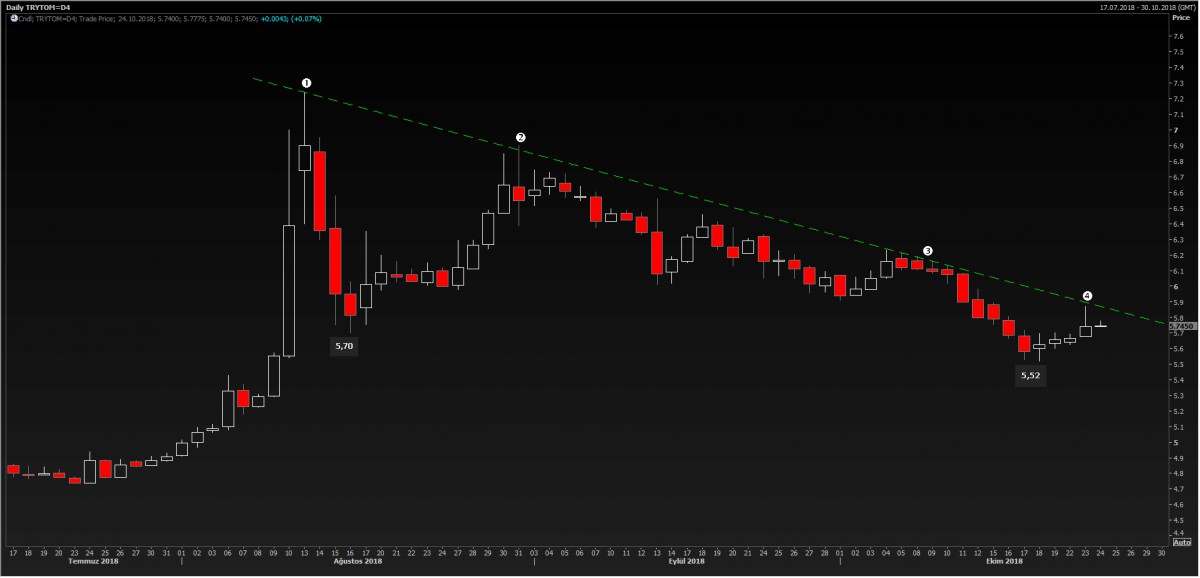 USD/TRY kurunda dün oldukça sert bir yükseliş yaşandı. MHP’nin beklenmedik çıkışı ardından Ankara gündemi karışırken, piyasalar yeniden olası bir erken seçim durumunda sandalye sayısı hesaplamaya başladı. Artan siyasi endişeler haliyle TL ve TL cinsi yatırım araçları üzerinde olumsuz baskı kurdu. USD/TRY kurunda teknik olarak düşüş çizgisine neredeyse varan bir yükseliş eğilimine tanıklık ettik (yeşil kesik 4 numara). Teknik manada, yukarda 5.88-5.90 seviyeleri aşılmadan yükselişin devamı yönünde herhangi bir gelişmeden şu aşamada söz edemeyiz. Hatta ve hatta, düşüş baskısının devam ettiği bile söylenebilir. Yeşil düşen trendin yukarı yönlü aşılması ve gecelik kapanış görmemiz durumunda, yükselişin kuvvetli bir şekilde devam edebileceği düşünülebilir.