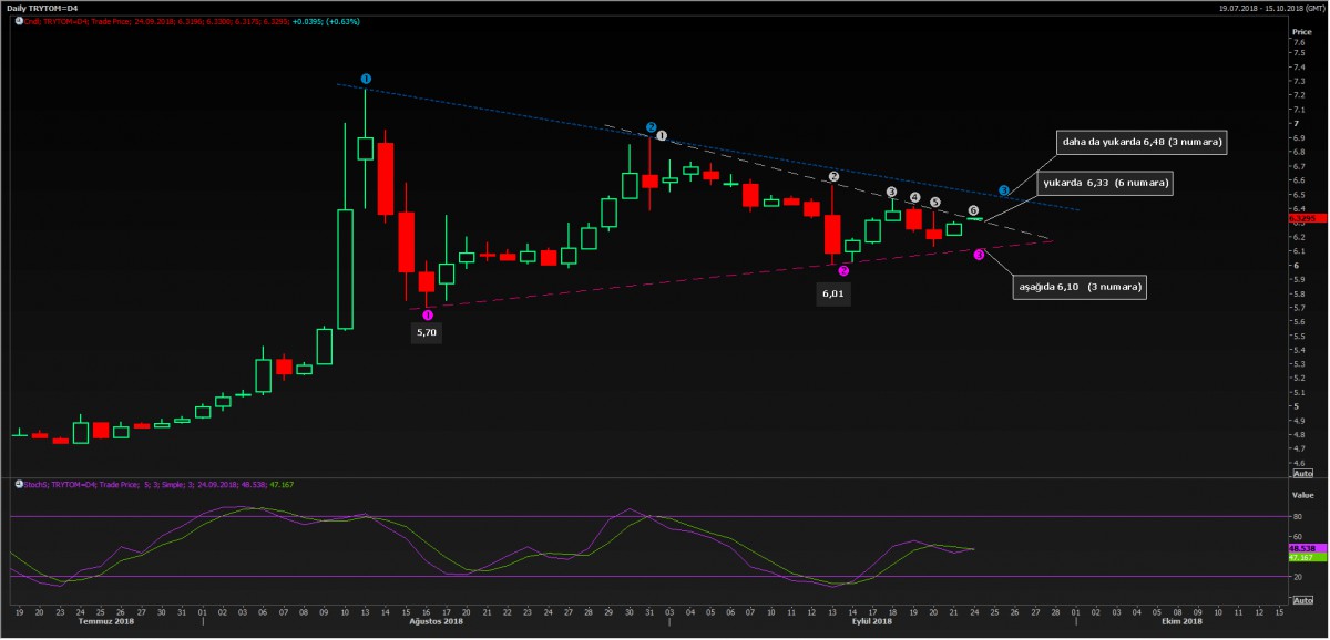 USD/TRY kuru geride bıraktığımız haftayı 6.29 seviyesinden, neredeyse cuma gününü tepesinde tamamladı. Yeni haftanın ilk kotasyonları da 6.32 seviyesinden bir başlangıca işaret ediyor (gri 6 numara). Bu minvalde, 6.33 seviyesinin üzerine doğru bir hareket daha da yukarda 6.48 seviyesine varan bir yükselişin önünü açabilir (mavi 3 numara). 6.30’un altına gevşemesi durumunda ise, daha da aşağıda yeniden 6.10 seviyeleri gündeme gelecektir (3 numara mor). Bugünkü görünüm, yukarı yönlü hareketin bir miktar daha olası olduğuna işaret ediyor.