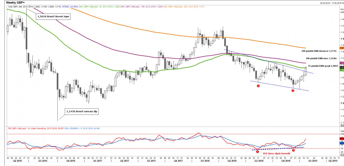 Senelerdir Brexit prangaları ile boğuşan sterlin, her ne kadar elle tutulur somut ve olumlu bir haber akışı henüz göremesek de, “haber yoktur, iyi bir haberdir” yaklaşımı ile değer kazanmaya devam ediyor. Başbakan May’in AB ile mutabakata vardığı Brexit tezkeresinin tarihi bir hezimet ile parlamentoda reddedilmesine rağmen, May hükûmetinin güven oyu alması ve beraberinde 29 Mart tarihinde yaşanacak AB ile boşanma tarihinden önce bir anlaşma zeminine varılacağına yönelik beklentiler, sterlinin değer kazanmasına neden oluyor. 1.30 seviyesinin aşılması ile içimizin kıpırdadığı sterlin cephesinde açtığımız uzun pozisyonumuz, ilk hedef seviyesi olan 1.3090’ı test etmesi ardından (55 günlük ortalama yeşil) kuzeye ilerlemeye devam ediyor. Teknik manada, 100 günlük ortalamaların geçtiği 1.3246 seviyesi (mor) bir sonraki hedef seviyemiz olarak ön plana çıkıyor. Beklenmedik bir haber akışına paralel sterlin cephesinde hava aniden sertleşebilir. Bu nedenle bu para çiftinde işlem yapanların aşırı dikkatli olması gerektiğinin altını çiziyoruz. Stop seviyemiz bugün itibarı ile başa baş seviye olan 1.30’a çektik.