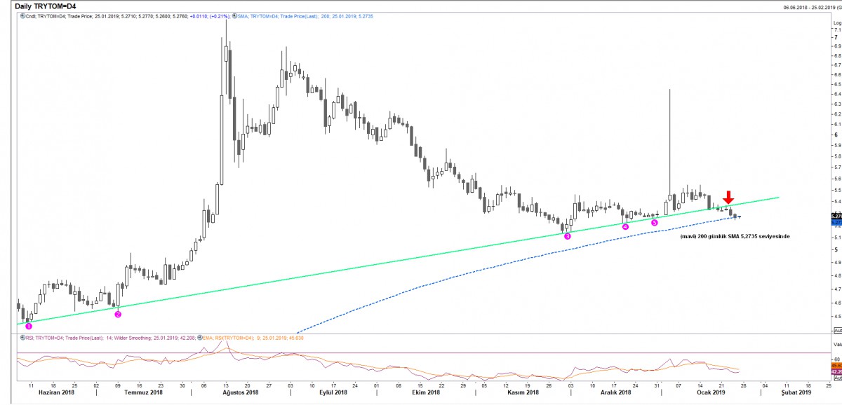 USD/TRY kuru, yeşil yükselen trend çizgisini evvelki gün kırması ardından dün 5.24’lü seviyelere kadar gerileyerek 200 gün ortalamaları zorladı. Gecelik kapanışın ise 5.2650 seviyesinde ve tam da 200 günlük basit ortalamaların geçtiği seviyede olduğunu not edelim. Bu sabah itibarı ile 200 günlük ortalama (mavi kesik çizgi) 5.2735 seviyesine bulunuyor. Dikkatle takip ediyoruz.