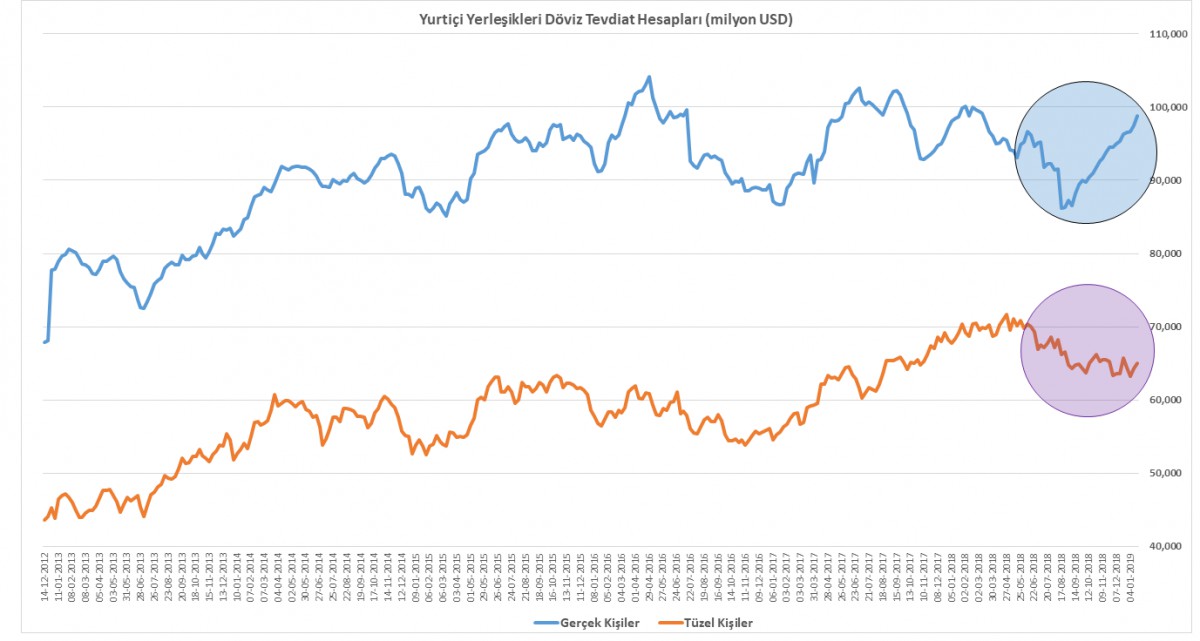 Her hafta perşembe günü açıklanan TCMB verilerine göre, yurtiçi yerleşik bireyler, 11-18 Ocak haftasında 1.4 milyar dolar daha alırken, bireylerin döviz mevduatları Ağustos 2018’e göre yaklaşık 13 milyar dolar artış gösterdi. Öte yandan, tüzel kişilerin döviz tevdiat hesapları, Nisan 2018 tepesine göre 6.1 milyar dolar azaldı (döviz borç geri ödemesinde kullandıklarını tahmin ediyoruz).