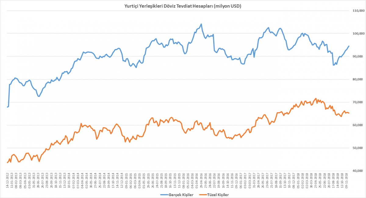 TCMB 16-23 Kasım haftasına ilişkin para ve banka istatistiklerini yayımladı. Gerçek kişilerin döviz tevdiat hesapları (DTH) geçen haftada da arttığını görüyoruz (0.6 milyar dolar). Öte yandan, tüzel kişilerin DTH 0.3 milyar dolar azaldı.