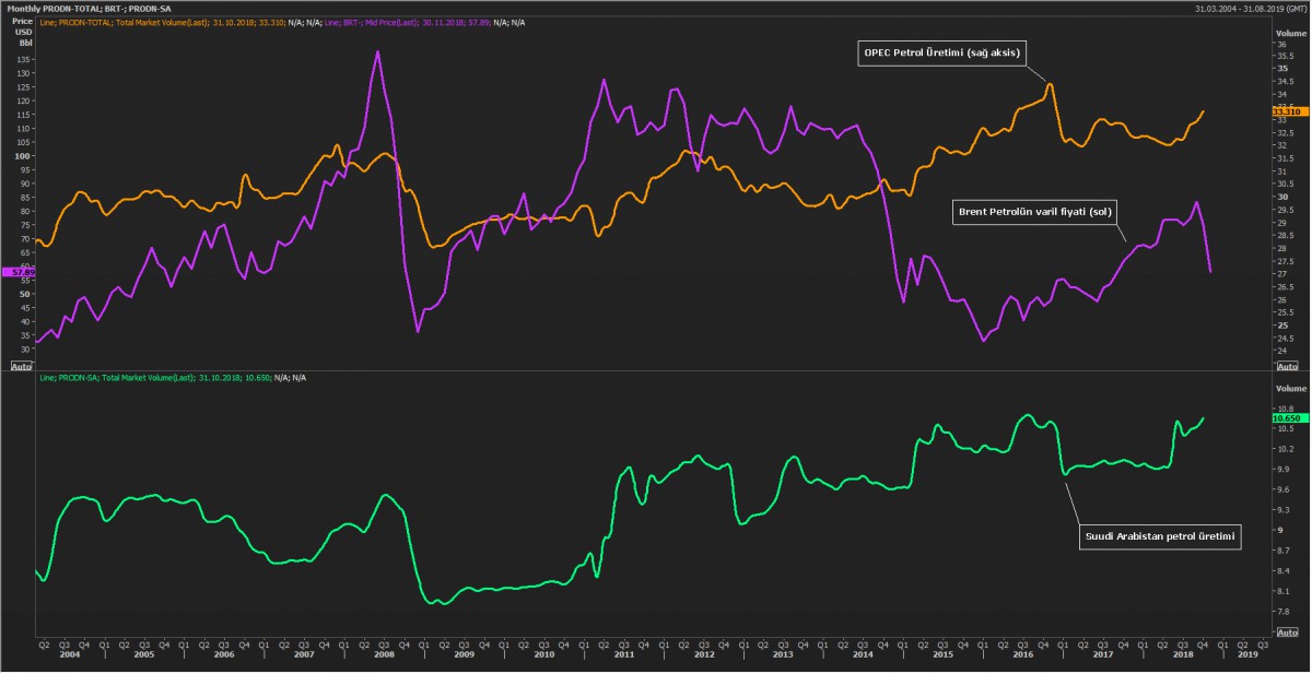 OPEC üyesi ülkelerin petrol üretimi artarken, Brent cinsi petrolün varil fiyatı ise gerilemeye devam ediyor. Bu bağlamda, özellikle, alt grafikte, Suudi Arabistan’ın dikkat çekici bir şekilde son dönemde artan petrol üretiminin altını çizmek gerekiyor.
