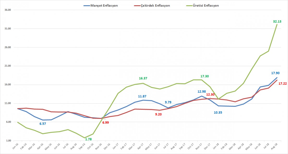 *Üretici enflasyonunda korkutucu bir tablo ile karşı karşıyayız. TL’nin şiddetli değer kaybı sonrasında üreticiye yansıyan aylık ÜFE enflasyonu %6.6 olurken, yıllık enflasyon da %32.13’e adeta uçmuş.
