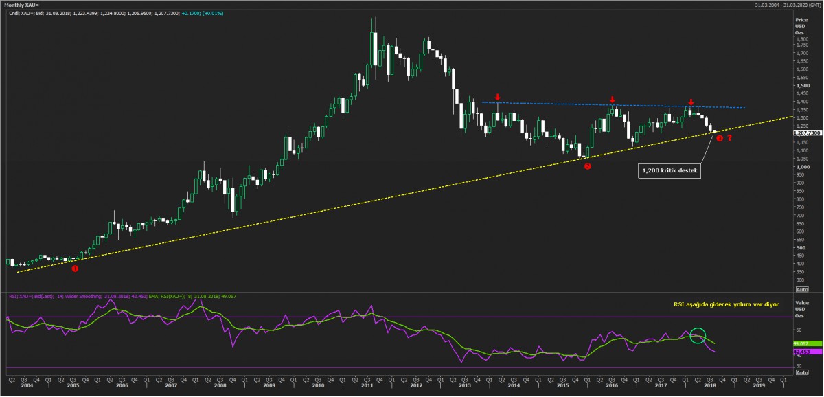 Doların değer kazanması ile altını ons fiyatı da baskı altına girdi. 1.200 usd/ons kritik destek bölgesinin altına geçmesi durumunda (3 numara), düşüş ivme kazanabilir.