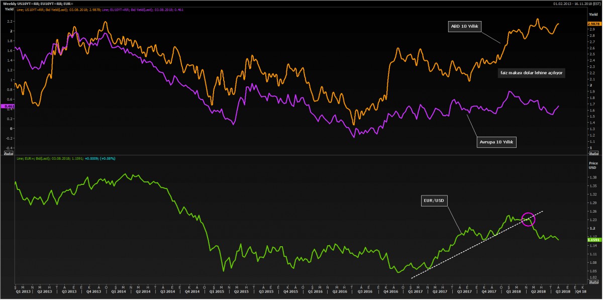 *Piyasaların risksiz getiri olarak gördüğü (gösterge) ABD 10 yıl vadeli tahvil faizlerinin yeniden %3 seviyesine yükselmesi bir tarafta, Avrupa Merkez Bankası’nın ise güvercin duruşu diğer tarafta EUR/USD paritesini 1.1580 ile son 6 haftanın en düşük seviyesine itti.