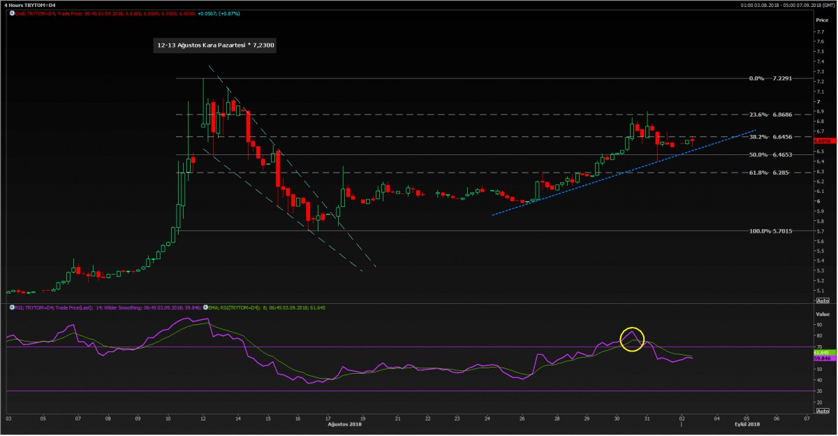 USDTRY kurunda 4 saatlik grafiklerde bir miktar da olsa gevşe sinyalleri alıyoruz. Cuma günü bültenimizde de belirttiğimiz üzere, güç göstergelerinden RSI, aşırı alım seviyesine ulaştığımıza yönelik sinyal vermişti (TL’nin aşırı satımı-sarı daire). Teknik bir bakış açısı ile, kurdaki gevşemenin enflasyonun büyük bir sürpriz yapmaması kaydı ile aşağıda 6.47-6.51; devamında ise 6.2850 seviyesine kadar devam edebileceğini göz ardı etmiyoruz. Yukarda ise 6.4650 seviyesine dikkat edeceğiz. TL’nin oynaklık oranının görülmemiş seviyelerde olması bakımından, elle tutulur ve güvenli analiz yapmanın zor olduğu günlerde geçtiğimizin altını önemle çizmek gerekiyor.