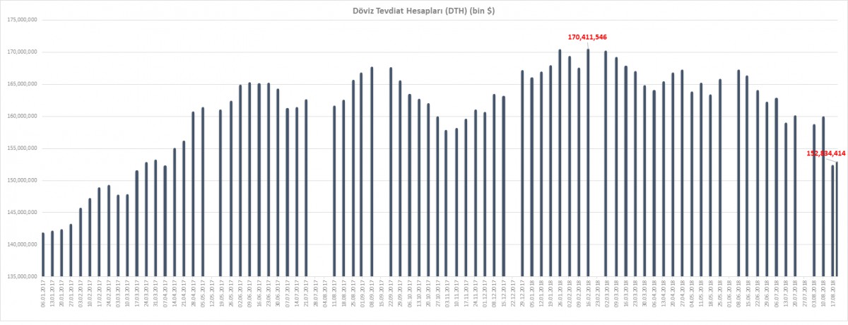 Yurtiçi yerleşiklerin toplam döviz mevduatı (DTH) 10-24 Ağustos tarihi arasında yaklaşık olarak 7 milyar dolar azalmış (5.3 gerçek; 1.7 tüzel). Bilançonun diğer tarafında ise TL mevduat kaleminde yaklaşık 28 milyar TL artış görülüyor. Bu dönemi kapsayan ortalama USD/TL kuruna bakarak, TL cephesinde artışın dolar karşılığının 4.5 milyar dolara tekabül ettiğini görüyoruz. Bu bakışı açısı ile DTH’daki 7 milyar dolar azalışın kabaca 2.5 miyar doları sistem dışına çıktığını düşünüyoruz.