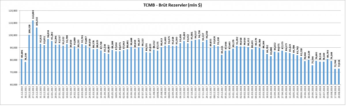 Öte yandan, TCMB’nin brüt döviz rezervleri yılbaşında 84.1 milyar dolardan, 20 Ağustos tarihinde 72.9 milyar dolara gerilediğini görüyoruz. TCMB’nin rezervlerinin gerilemesini büyük bir kırılganlık olarak okuyoruz.