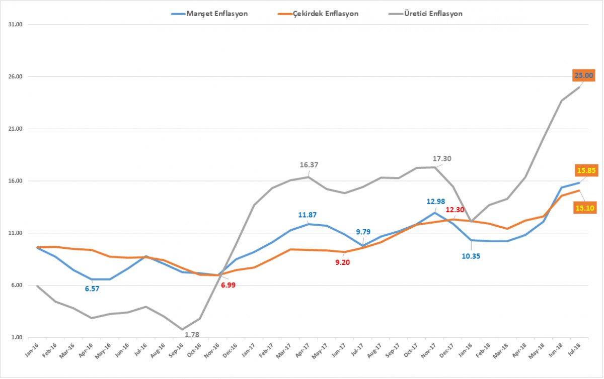 *Bu verilere göre, Temmuz ayında TÜFE piyasa beklentisi olan %0.9’un altında %0.55 artış kaydetti. Bu sonuçla birlikte yıllık enflasyon oranı %15.85 seviyesinde gerçekleşti (Temmuz 2017 %9.79).