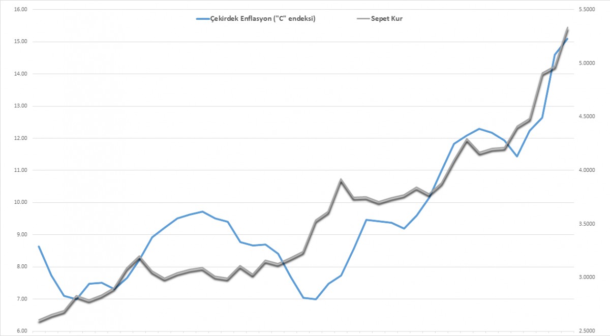 Çekirdek göstergelere baktığımız zaman, "C" tanımlı endekste aylık artış %0.93 olurken yıllık oran ise %15.10 oldu (tarihi zirve)