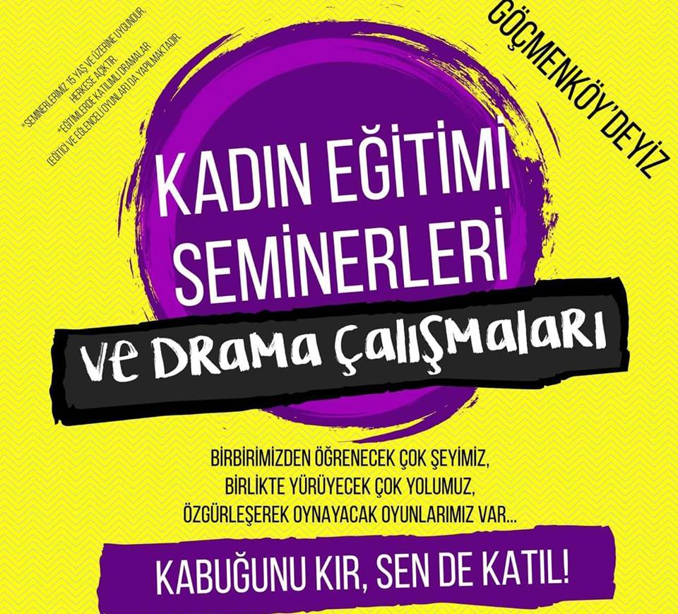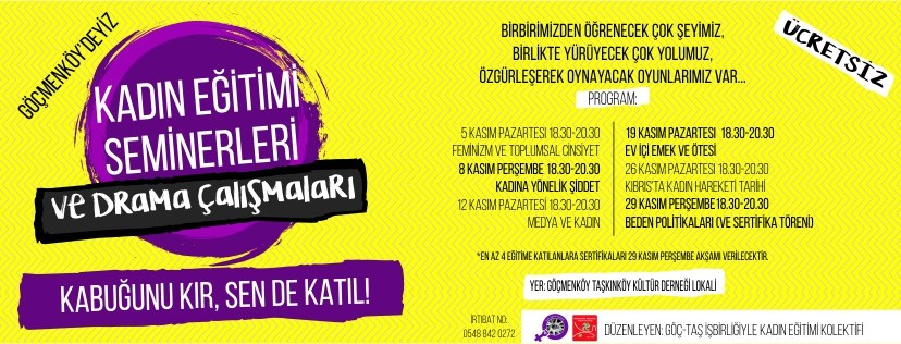 Kuzey Kıbrıs’ta, kadınların ve toplumun özgürleşmesi amacıyla bilgi ve deneyim paylaşımları yapan, drama atölyeleriyle özgürleşmeyi prova eden bir kuruluş olan Kadın Eğitimi Kollektifi, kadın eğitimi seminerleri ve Drama Çalışmaları kapsamında 5 Kasım 2018 Pazartesi günü “Feminizm ve Toplumsal Cinsiyet” konulu seminerle dün ilk seminerini gerçekleşti. Önümüzdeki günlerde gerçekleşecek olan seminerler ise şu şekilde.