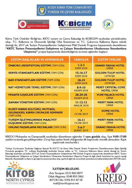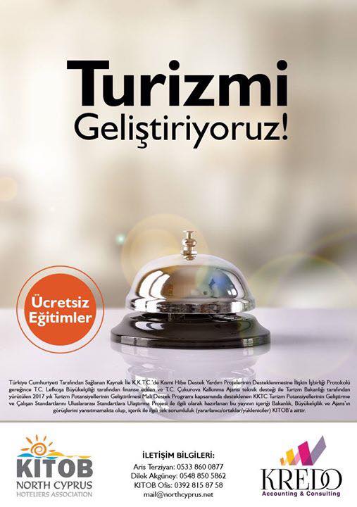 “2017 yılı Turizm Potansiyellerinin Geliştirilmesi Mali Destek Programı” kapsamında desteklenen ve “KKTC Turizm Potansiyelleri Geliştirme ve Çalışan Standartlarının Uluslararası Standartlara Ulaştırma” projesi kapsamında kredo muhasebe ve danışmanlık tarafından düzenlenen ücretsiz eğitimler başladı.