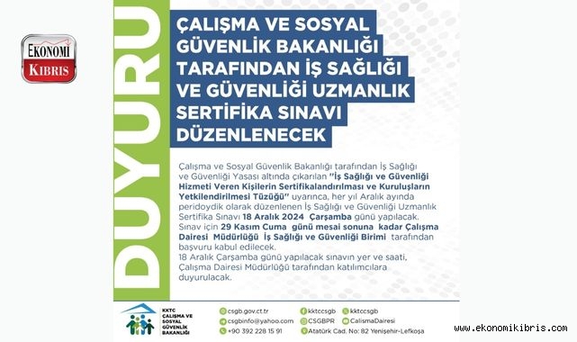 KKTC Çalışma ve Sosyal Güvenlik Bakanlığı, İş Sağlığı ve Güvenliği Yasası altında çıkarılan ''İş Sağlığı ve Güvenliği Hizmeti Veren Kişilerin Sertifikalandırılması ve Kuruluşların Yetkilendirilmesi Tüzüğü'' uyarınca, her yıl aralık ayında düzenlenen İş Sağlığı ve Güvenliği Uzmanlık Sertifika Sınavı, 18 Aralık Çarşamba günü yapılacak.Bakanlık duyurusuna göre sınav için 29 Kasım Cuma mesai sonuna kadar Çalışma Dairesi Müdürlüğü İş Sağlığı ve Güvenliği Birimi tarafından başvuru kabul edilecek.Sınav yer ve saatinin, Çalışma Dairesi Müdürlüğü tarafından katılımcılara duyurulacağı kaydedildi.