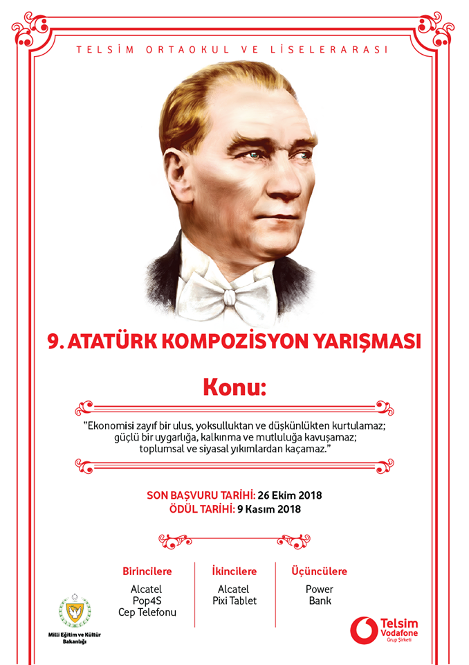 KKTC Telsim'in Milli Eğitim ve Kültür Bakanlığı iş birliğiyle 9 yıldır düzenlediği Ortaokullar ve Liselerarası atatürk kompozisyon yarışması bu sene de yapılıyor. yarışma ile ilgili detaylı bilgi şu şekilde: