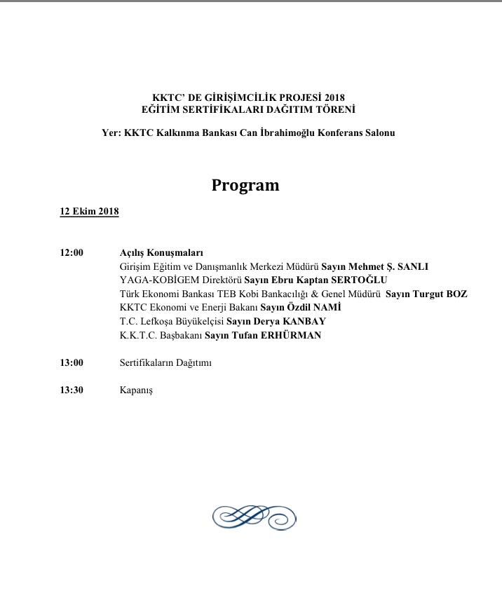 Kuzey Kıbrıs’ta yer alan kobiler kapsamında olan projelerin takibi, geliştirilmesi ve planlanması hususunda çalışmalar yapan KOBİGEM (Küçük Orta Boy İşletmeleri Geliştirme Merkezi), bugün girişimcilik eğitim programı sertifikalarını dağıtacak.