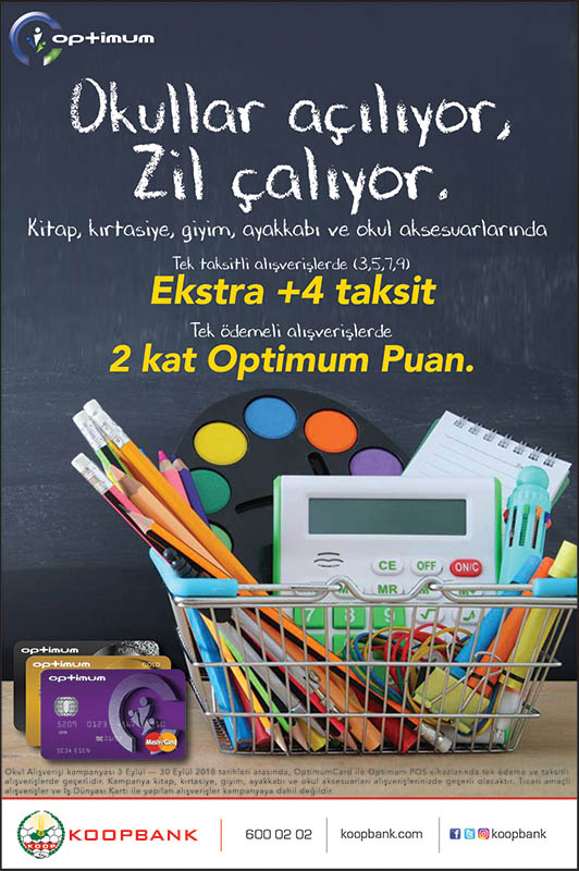 Koopbank müşterilerine OptimumCard ile tek taksitli (3,5,7,9) okul harcamalarına ekstra +4 taksit, tek ödemeli alışverişlerde ise 2 kat Optimum Puan fırsatını sunuyor.
