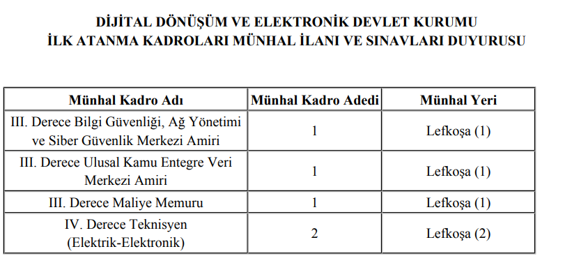 Kuzey Kıbrıs’ta iş arayan veya iş değiştirmek isteyenlerin münhal kaynağı Ekonomi Kıbrıs olarak yeni bir seçenek paylaşıyoruz.Kuzey Kıbrıs Türk Cumhuriyeti Kamu Hizmeti Komisyonu Başkanlığı Dijital Dönüşüm ve Elektronik Devlet Kurumu kadroları altında bulunan mevkilerin doldurulması için münhal ilan açtı.1. Başvurular Münhal kadrolar ile ilgili olarak Kamu Hizmeti Komisyonuna yapılacak başvurular, 24 Aralık 2024 - 19 Eylül 2025 (her iki tarih dahil) tarihleri arasında kabul edilecektir.
