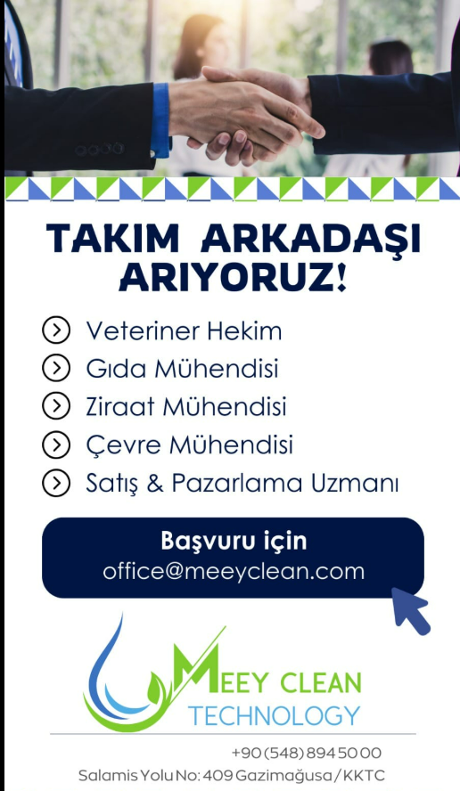 Kuzey Kıbrıs’ta iş arayan veya iş değiştirmek isteyenlerin münhal kaynağı Ekonomi Kıbrıs olarak yeni bir seçenek paylaşıyoruz.Kıbrıs'ın eşsiz güzelliklerini korumak ve geliştirmek amacıyla yola çıkan sürdürülebilir ve etkili ürünler geliştirmeyi ilke edinmiş KKTC'nin köklü firmalarından Meey Clean Technology münhal açtı.-Veteriner hekim-Gıda mühendisi-Ziraat mühendisi-Çevre mühendisi-Satış pazarlama uzmanı