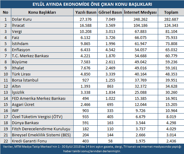 Medya Takip Merkezi (MTM), Ekonomi Gazetecileri Derneği için yaptığı araştırmada, Eylül ayının ekonomi başlıklarını belirledi. Dolar, en çok konuşulan haber başlığı olmaya devam ederken, ihracat ve vergi gündemin diğer önemli başlıklarını oluşturdu. İşte, MTM’nin hazırladığı ekonomi raporunun detayları…
