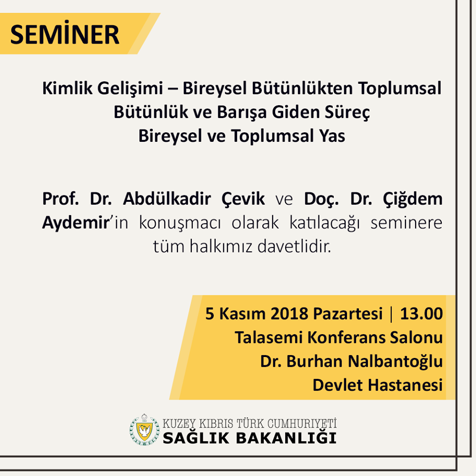 KKTC sağlık bakanlığı tarafından “Kimlik Gelişimi - Bireysel Bütünlükten Toplumsal Bütünlük ve Barışa Giden Süreç Bireysel ve Toplumsal Yas” konulu seminer düzenleniyor.